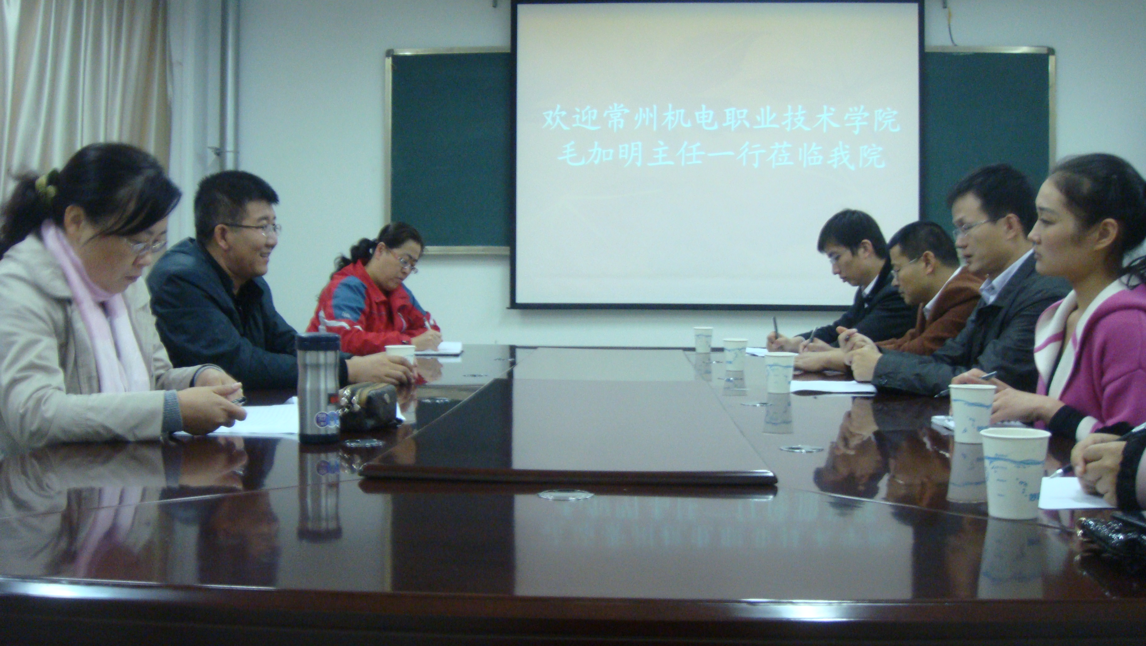 2013年11月8日,常州机电职业技术学院社科部毛加明主任一行6人至我校思政部(大学生素质教育中心)进行交流。崔宏利主任、赵岚副主任接待了客人。双方就公共艺术课程设置情况、课程建设及改革、思想政治理论课建设与改革等方面进行了探讨。此次交流,互通有无,取长补短,共同促进,双方均感获益良多。